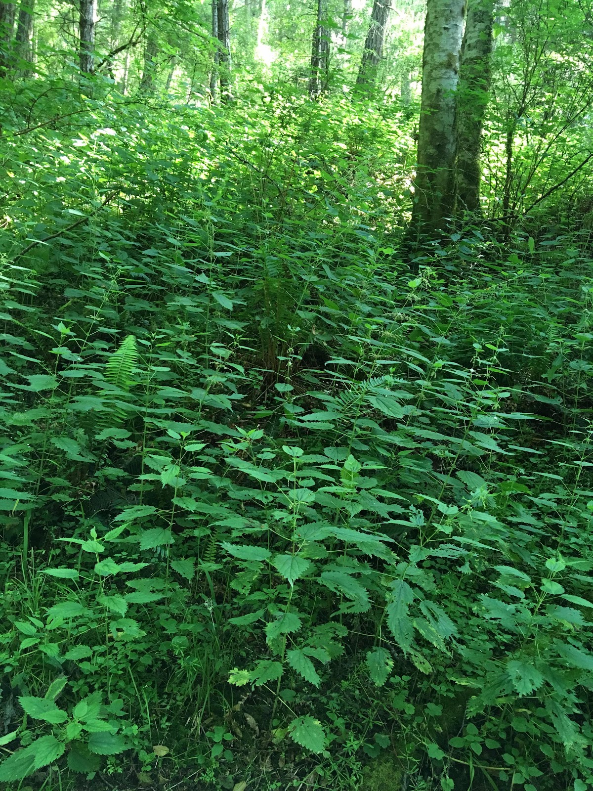 Fortunately I was in pants not a skirt and I forged through. As I did, a wisp of song went through my mind (I cannot discover where it comes from but it went “I would swim through an ocean for you and for me, I would swim through an ocean for you” or was it “ I would walk through a desert for you”?). I was singing it to that spot of radiant warm earth basking in the sun in front of the tree: “I would walk through these nettles for you.”