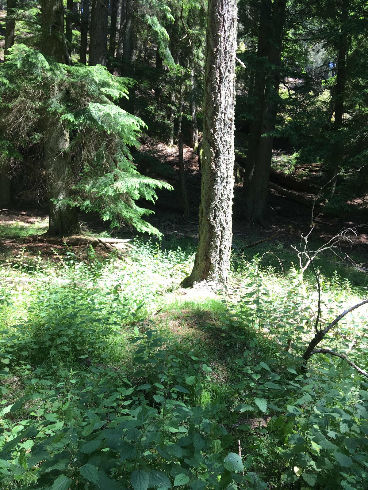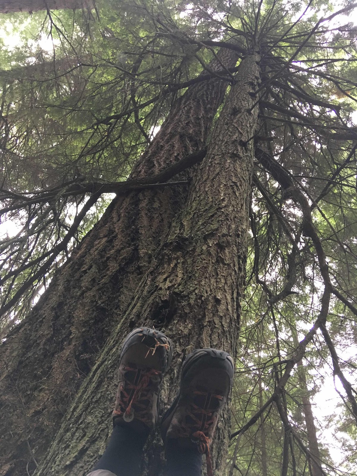 As I was hiking today it was mostly overcast and the moments of sun were very welcome. For my last rest stop, I realized I wanted to find a tree I could lean my legs against in inverted pose that would be in the sun. It’s actually hard to find a tree with a level area beside it and no protruding roots or rocks, let alone such a tree in the sun (when the sun might disappear behind clouds at any moment) so I knew the odds were against me, when I spotted the perfect tree - of course I had to walk through a small sea of nettles to get there. (Photo 1)