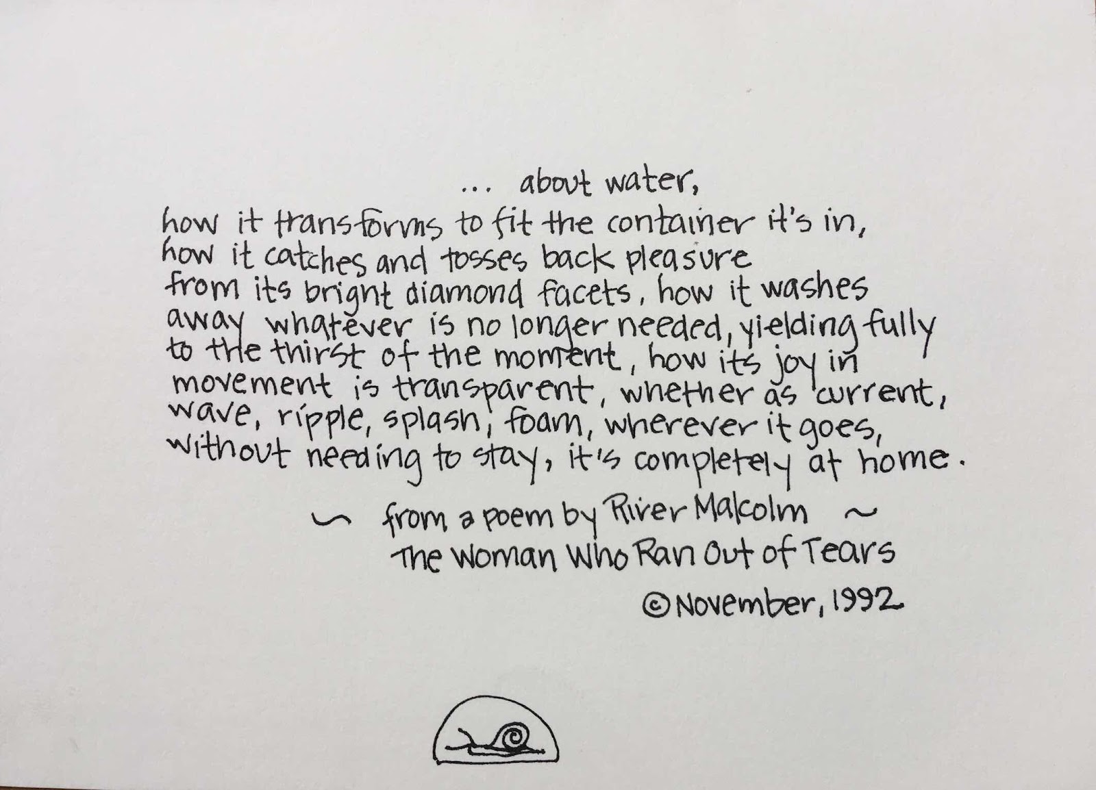 When I was looking through Judy’s cards for the one about water, I came across this one that for me is about letting go and trusting. The young bird makes me think of the raven with the blue of the sky in its eye. I guess I am thinking of the summer feeling, trusting enough to let it be and let it go. Let it fly to wherever it is going. So let’s end now (and thank you for walking with me, and may we meet on the trail again) with the back and front of Judy’s card - photos 11 and 12.